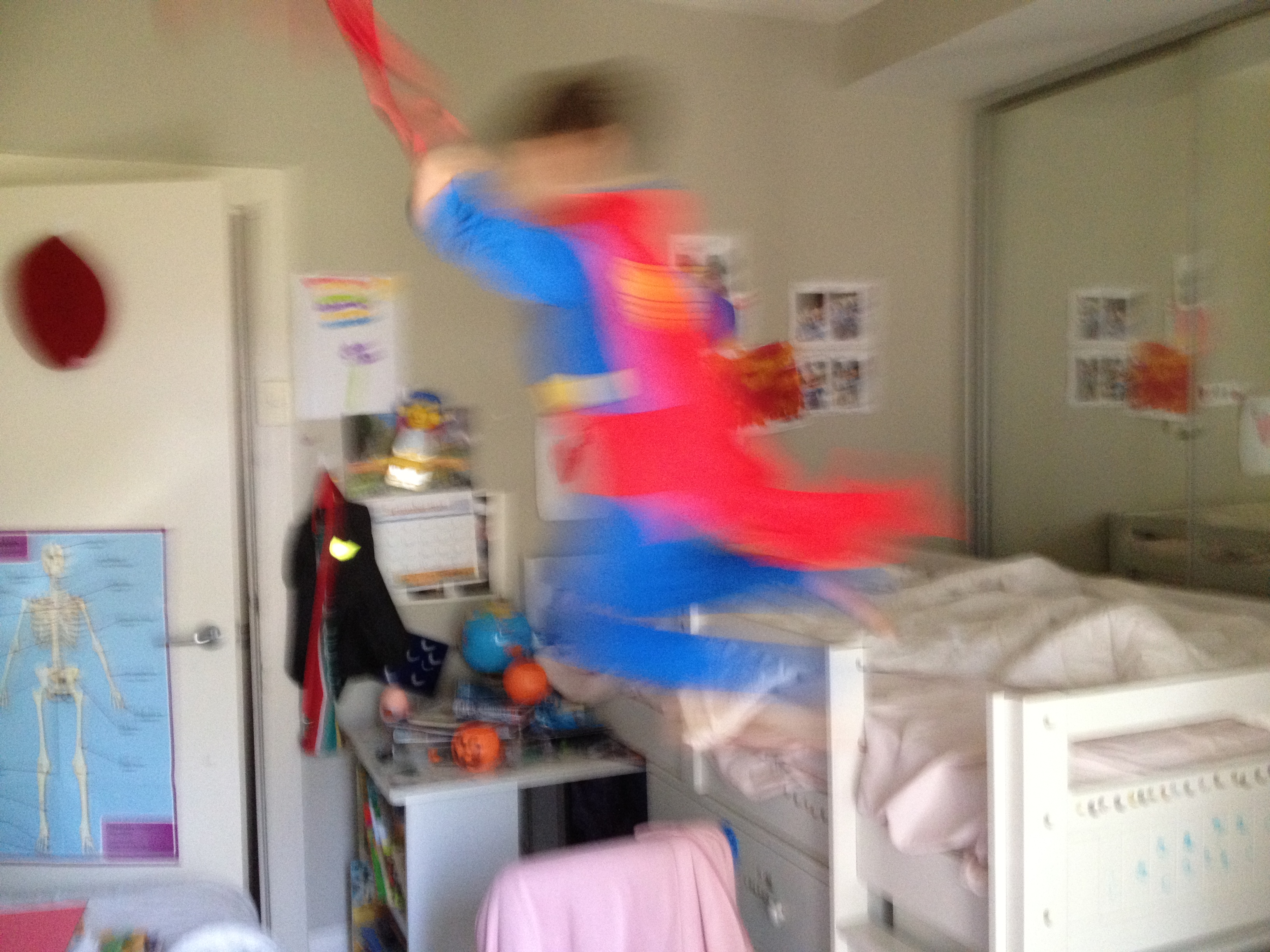 “No, I want to dress up as Superman and jump off my bunk bed.” he announced. Who am I to argue with the vagaries of five-year-old life. Here’s a picture:
