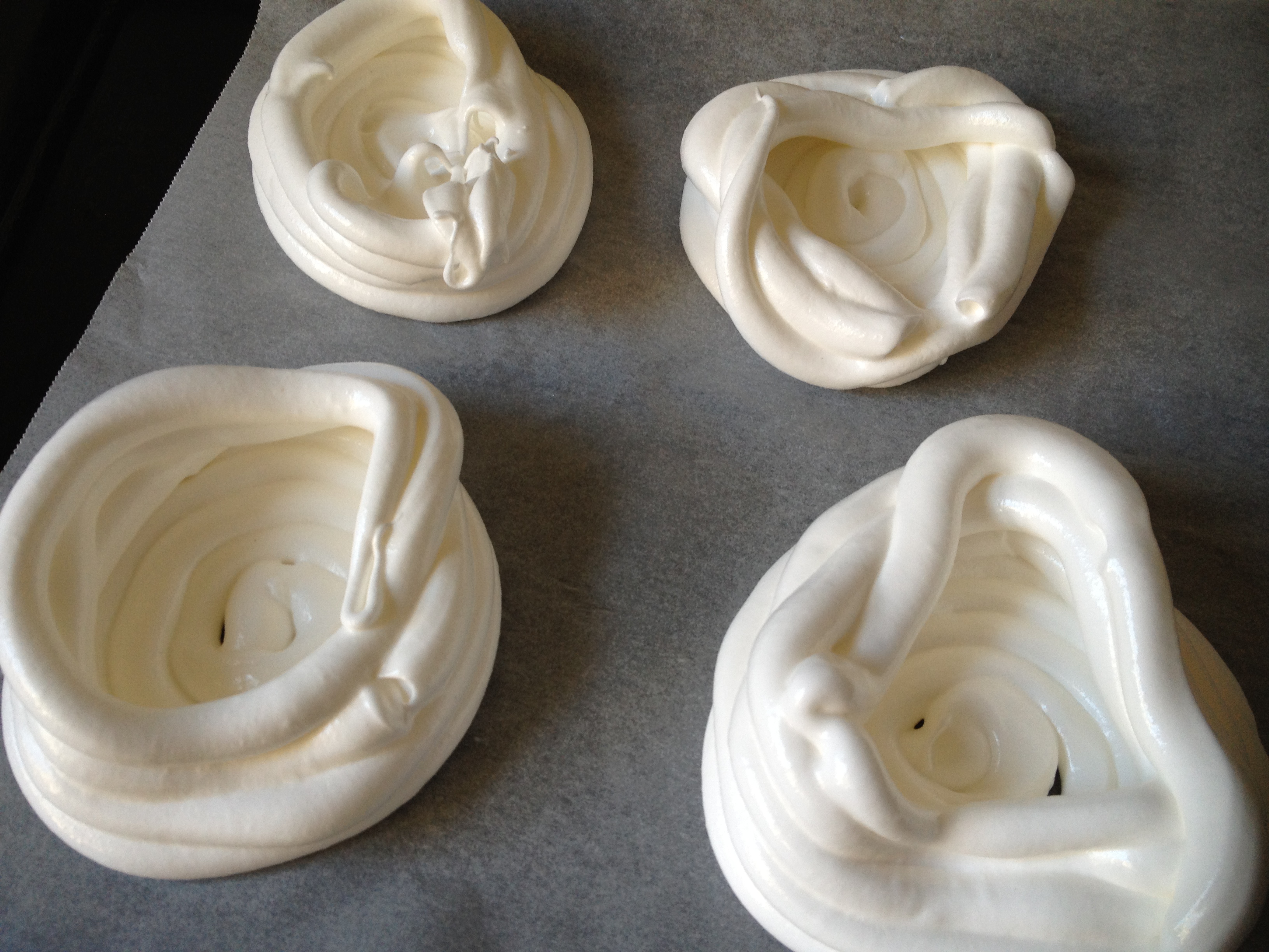I enjoyed beating the egg-whites with mum’s 70s egg-beater. It’s quite the workout. A pinch of salt, more beating, then I poured sugar on to those stiff white peaks and beat again, until I had snow-covered mountains of meringue. After folding in more sugar, I spooned the confection into a piping bag and piped out coils, building up the outer ring to make little meringue nests. They looked like the effort of a beginner potter, Dali-esque clocks melting in the late afternoon sun streaming in my kitchen window. I popped them in the oven for a slow, low suntan.