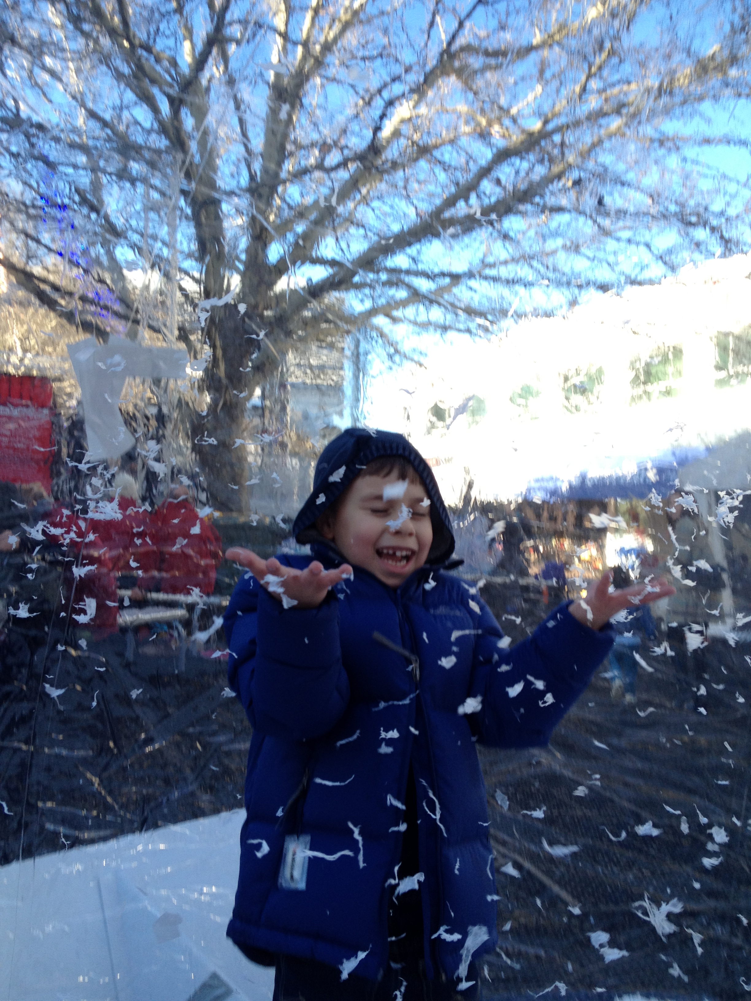 This giant inflatable snow-globe had an attendant (unlike the one at Darling Quarter in Sydney), so for $2 we could step inside to frolic in the “snow”. We stayed in there for minutes on end and posed for many happy selfies. Goodness knows what that fake snow was made of, but the snow-globe attendant helpfully told me, “If he gets it in his mouth, tell him to spit it out.”