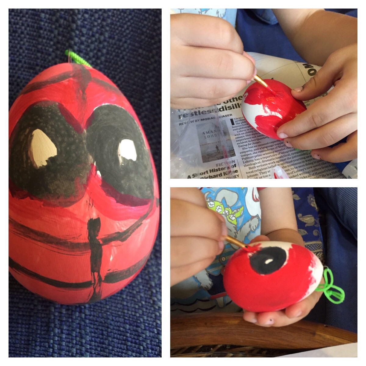 The kit contained a paint set and six eggs with a string loop on each (to hang on your egg-tree? Apparently they’re making a comeback). I had visions of pastel-hued eggs in a basket, but Spider Boy’s decorating aesthetic does not match my own…