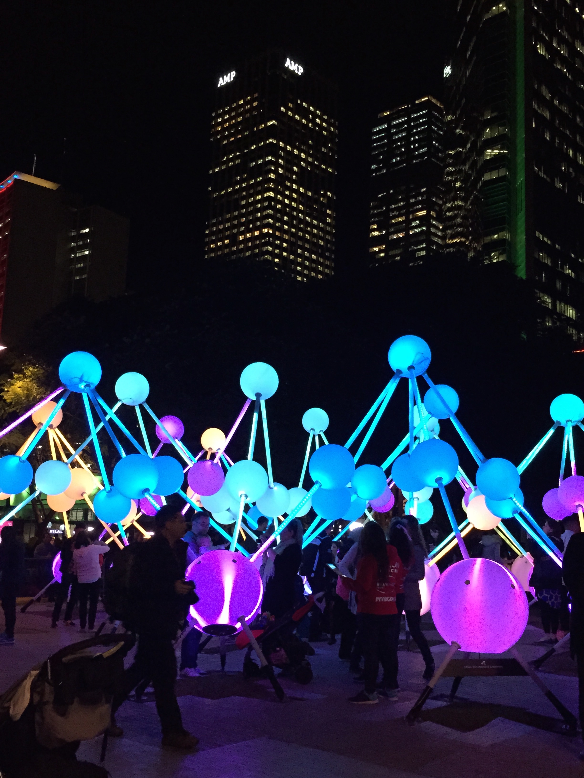 This dynamic large-scale light installation, Affinity, is by artists amigo and amigo (Simone Chua and Renzo B. Larriviere). Vivid’s website explains that the piece represents the complexity and connectivity of the human brain. When people arrive at Affinity, there is a web of darkened dormant orbs, except for a small trail of light that bounces between them. As people touch the globes, light flows in, linking the orbs.