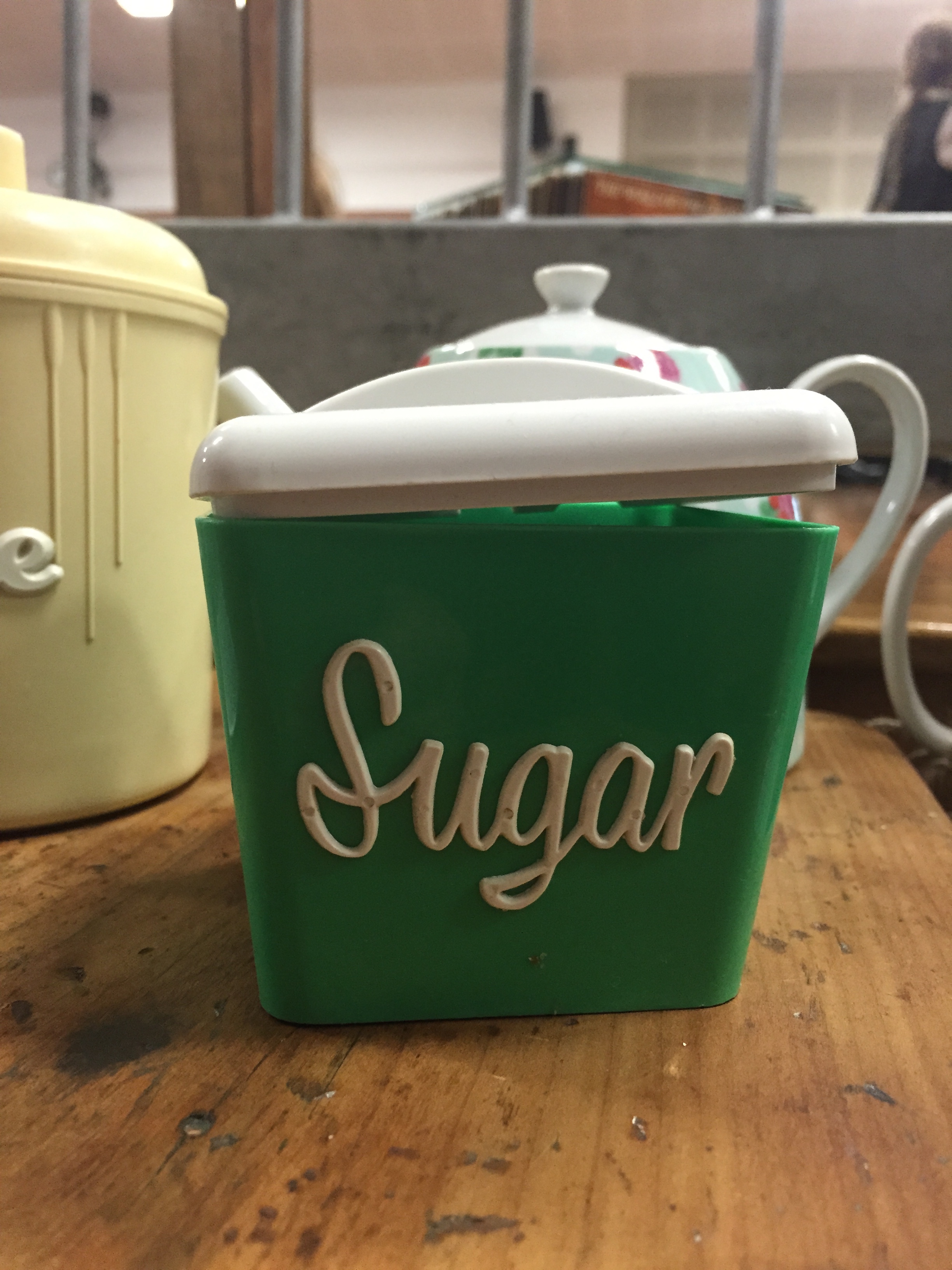 But refined white sugar is kind of my thing… so when I saw this 50’s-style sugar canister (which disappointingly only contained air) at Spider Boy’s school art show, I had to steal a photo. Maybe sugar itself will be a relic from the past one day, just like this canister. Sigh.