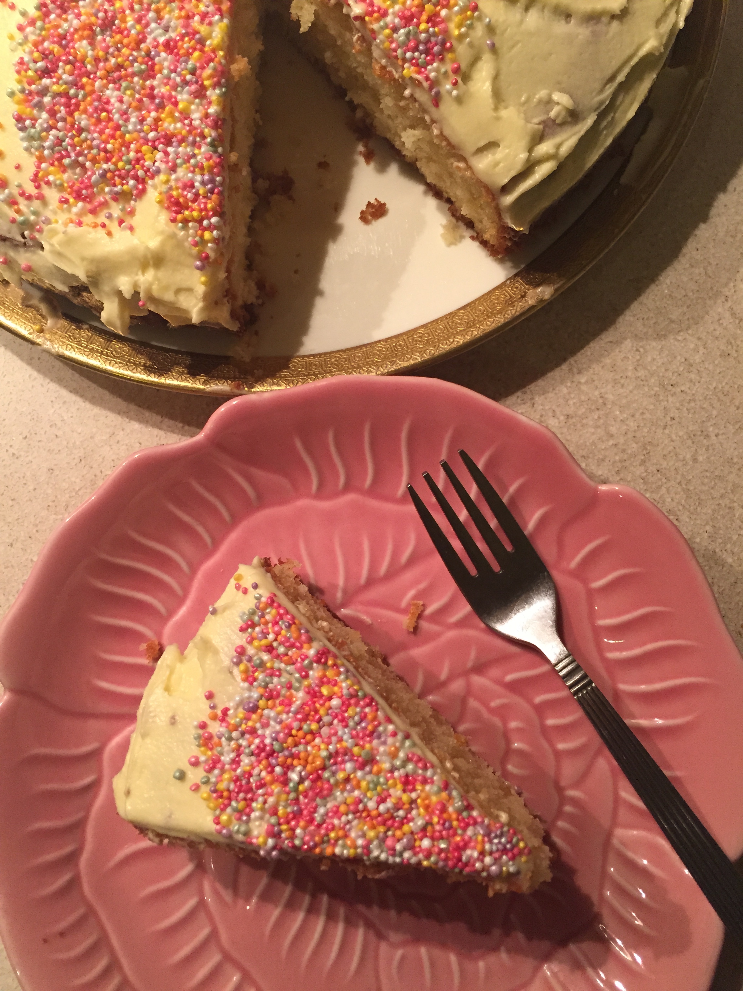 This cake I made last Sunday was meant to be a lime syrup cake. I had all the ingredients, except limes. I had a bottle of lemon juice in the fridge, so I used a bit of that. But then after making the cake, I RAN OUT OF SUGAR. So had no sugar to make the lemon syrup.  So it wasn’t going to be a syrup cake at all, was it? So I defrosted some left-over cream-cheese icing from the Father’s Day carrot cake I’d made, and dolloped that on. Plus some hundreds and thousands just for fun and fancy.