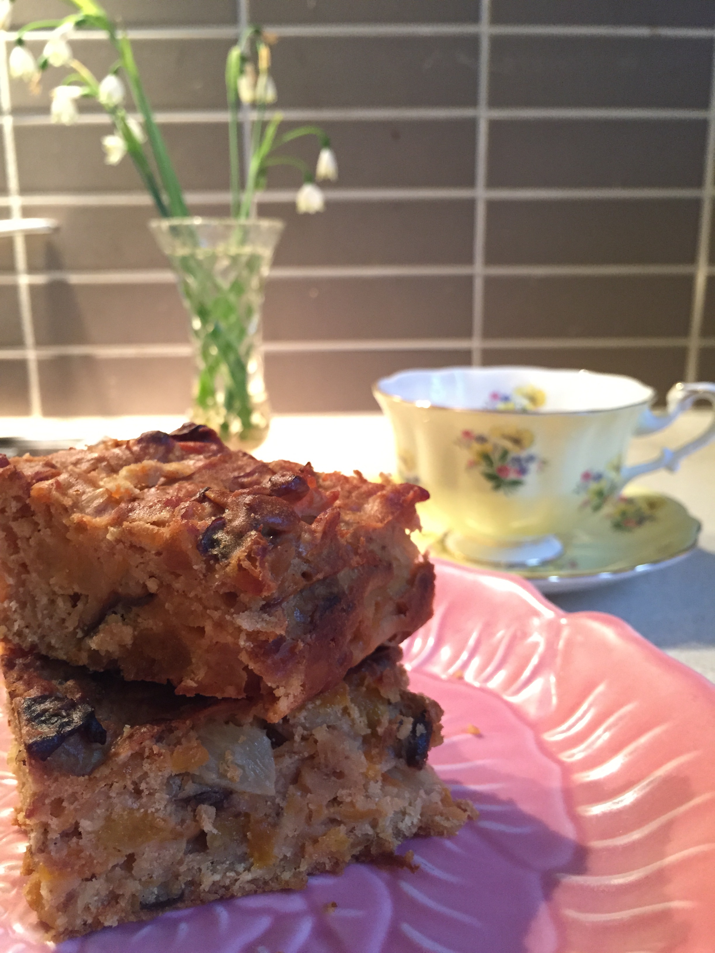 Spoon the mixture into the tin and decorate with dried apple rings brushed with a tablespoon of warmed honey. Bake in the preheated oven for 20 minutes (that’s what the book says, but for me/my oven it’s always more like 25 – 30 minutes, but just keep an eye on it).