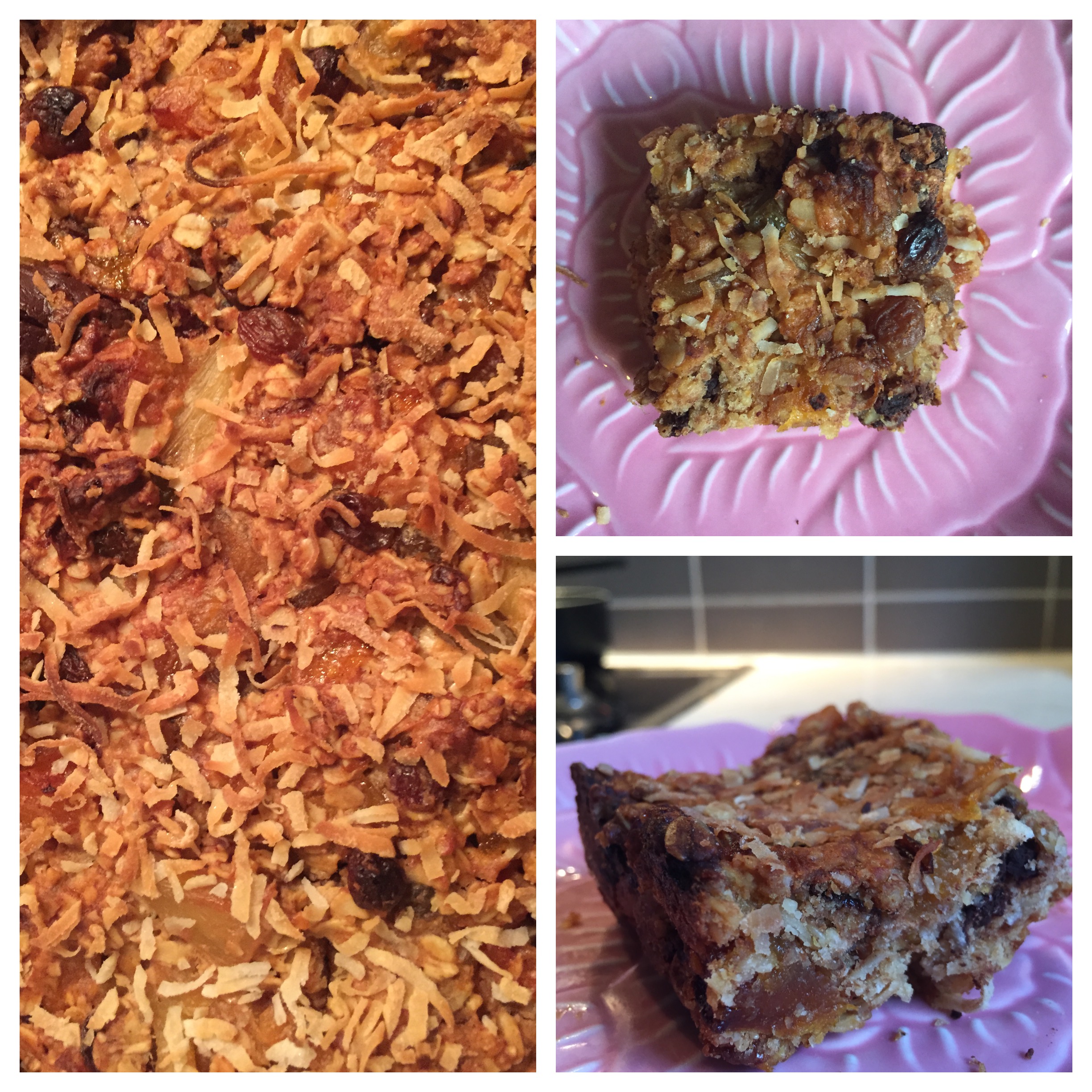 Anyway, there’s a recipe in Tiffiny’s book for fruity oat slice. I like to call it apricot slice as that’s the dominant fruit for me.  It is simple, healthy (well not UN-healthy) and absolutely yummy. It has no refined sugar (just lots of fruit) and it is something you could enjoy a small bit of every day. It’s not the reason I’m overweight. That would be the ice-cream with chocolate sauce, soft cheeses, etc. but that’s another story.