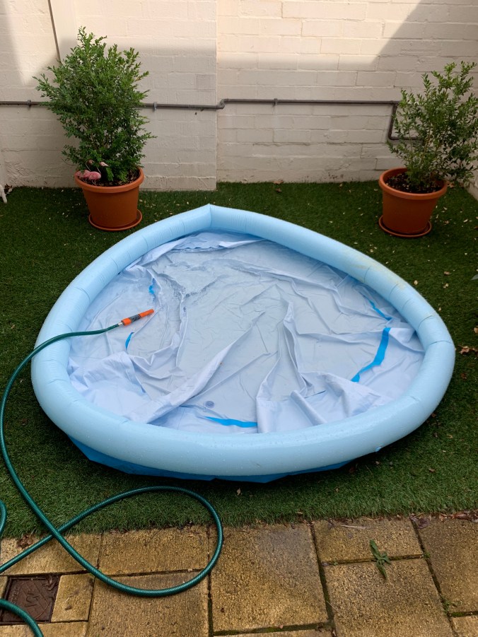 There was a half-hearted attempt at this wading pool in the front-courtyard-with-fake-grass after work.