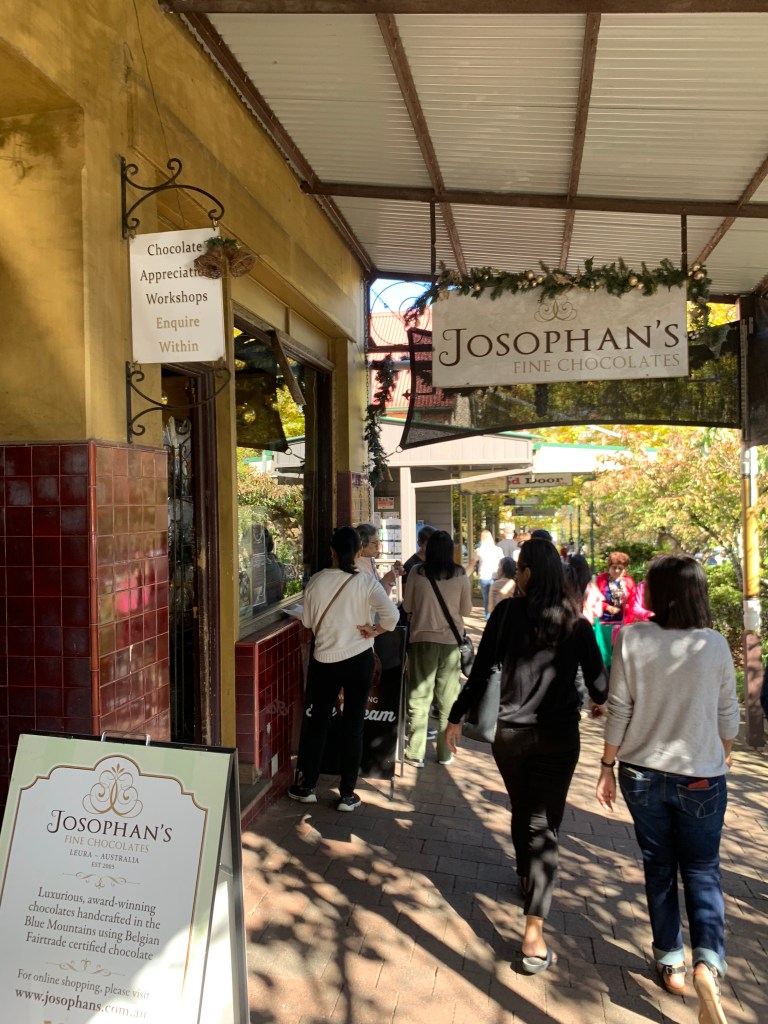 George was disappointed Woolworths was shut – he couldn’t get his hot fried chicken wings, but he cheered up with pizza at Leura Garage, a cafe with Bondi-style prices in a charmingly decorated converted garage. It was very good Margarita pizza though. We bowled up to the host standing behind a lectern at the cafe entrance who informed us we could go on a “wait list” for a table and he would phone us when one was ready. To make the most of our time, we hurried over to the gourmet chocolate shop “Josophans” around the corner and selected a few items. Just as I was about to queue up to pay, I got the call from Leura Garage… a table was ready now! No time to purchase chocolate, I planned to return later. So much for peaceful village life.