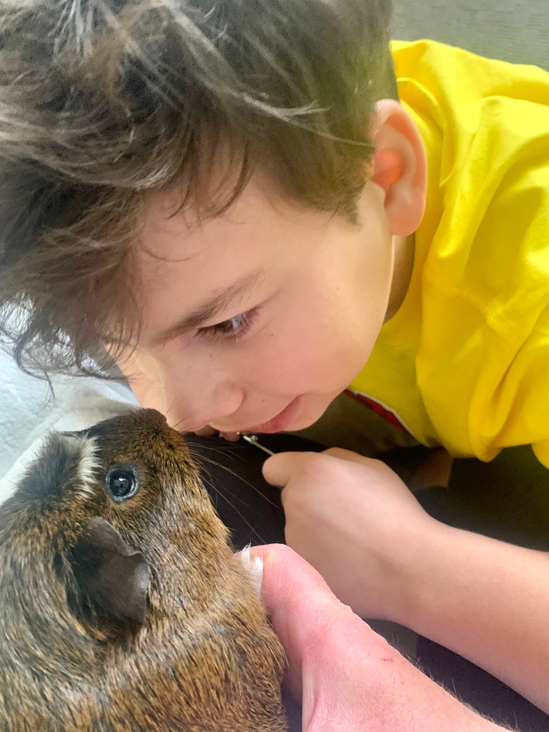 As for Peanut the guinea pig, our meekest guinea, I had to execute a delicate procedure involving scissors to remove him from said cardboard tube. Don’t worry, it was only the very thick cardboard that was cut, with me squeezing the tip of my finger in between the cardboard tube and Peanut to make sure the scissors didn’t touch his flesh. The poor little thing – he’s fine, but I’ll never forget the panicked wheeks he made when the tube rolled with him in it and he realised he was stuck.